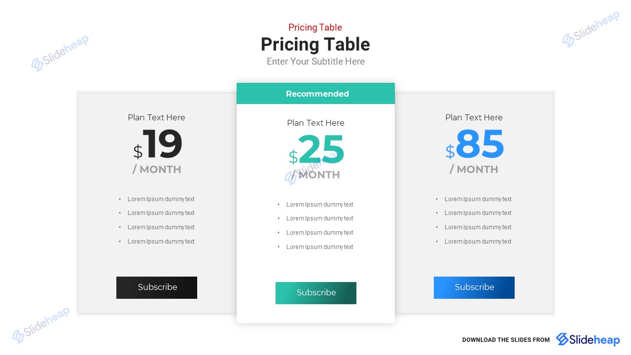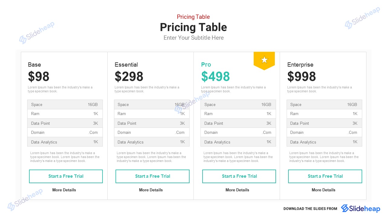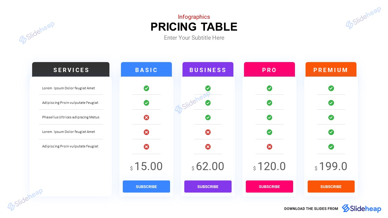 A infographic price table template is a significant tool for every marketer or professional from sales, entrepreneurs. It comes handy on numerous occasions. Find the right infographic pricing table template to showcase your pricing strategies is really hard. To sort out the complications, Slideheap offers a plethora of best pricing table infographic designs. This pricing table design assists professionals in unfolding their pricing plans and methods, which assists employees in understanding the market and gaining new customers. You don’t need to design a new table layout each time you draft proposals, pricing plans, or services to your clients. Simply download these entirely customizable infographic pricing table templates and provide your information or data.